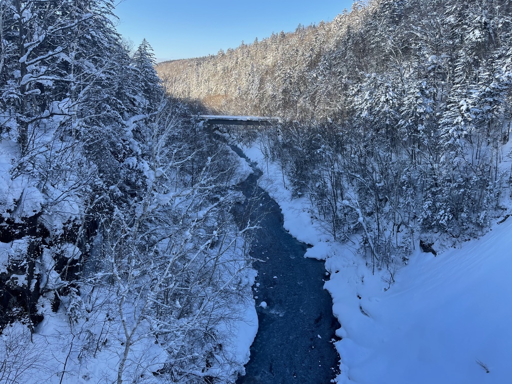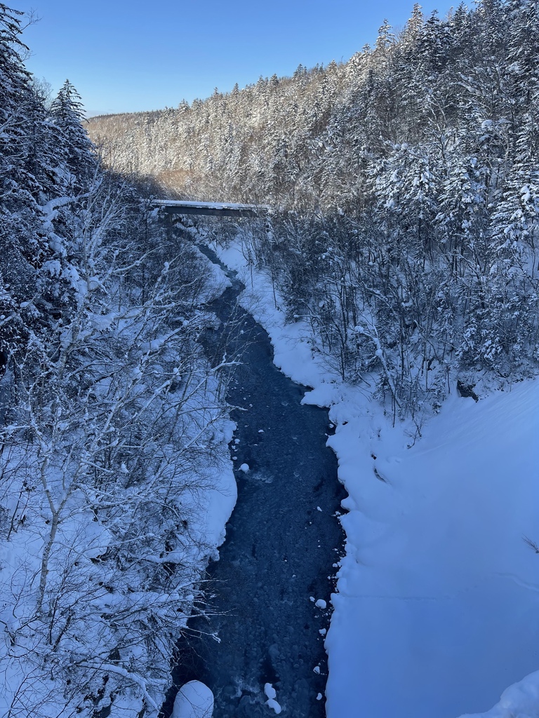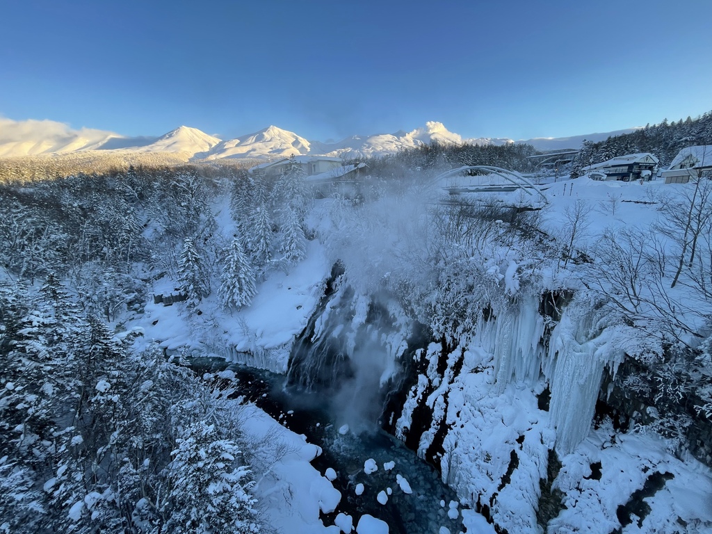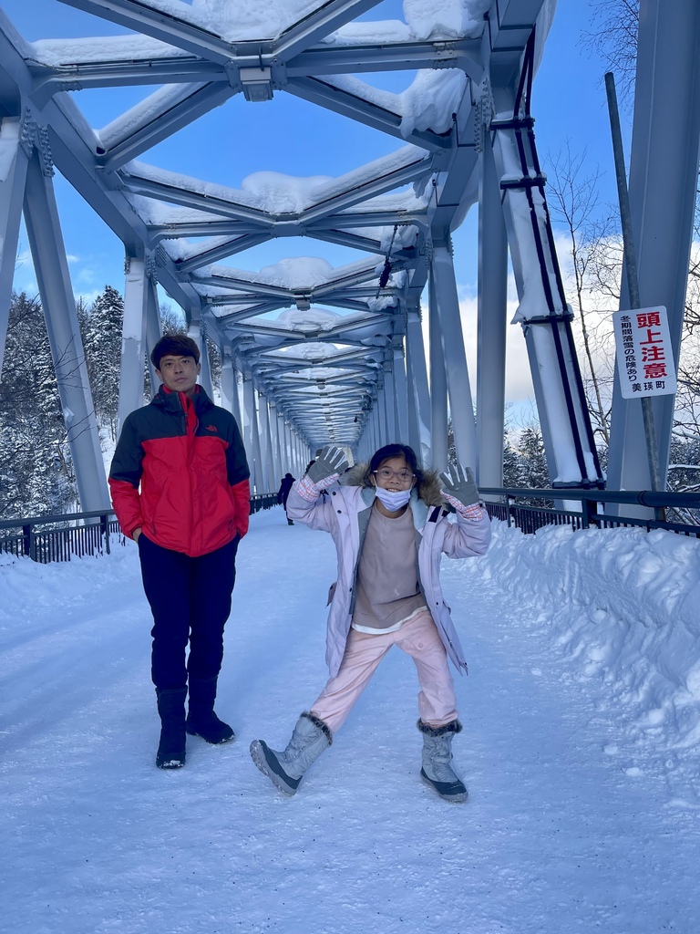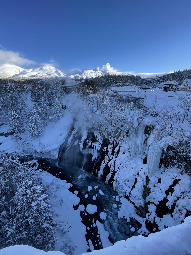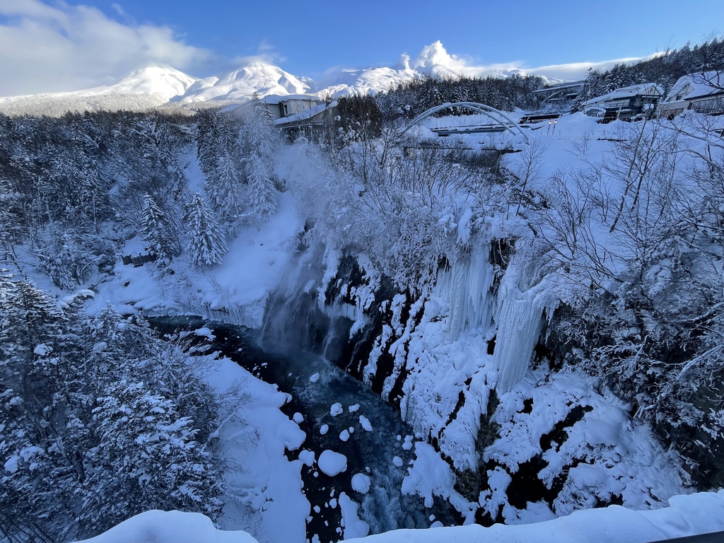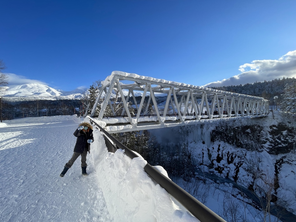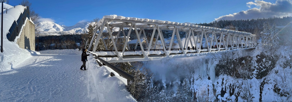 白鬚瀑布應該是有冰柱往下,又被雪覆蓋而很像白鬚吧?後面的十勝岳也很壯觀,而我們住的飯店跟剛剛走過的小鐵橋從這裡也都可以拍到。