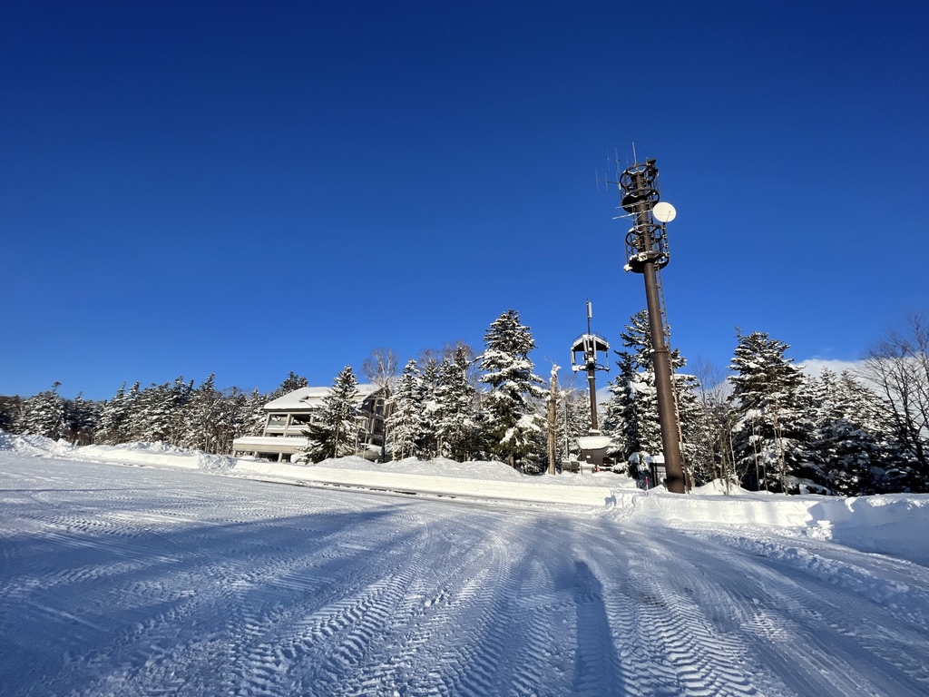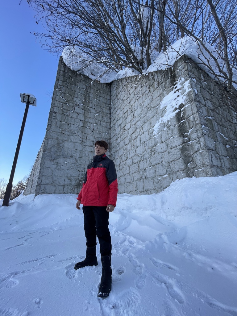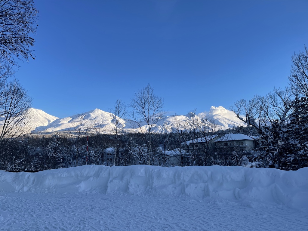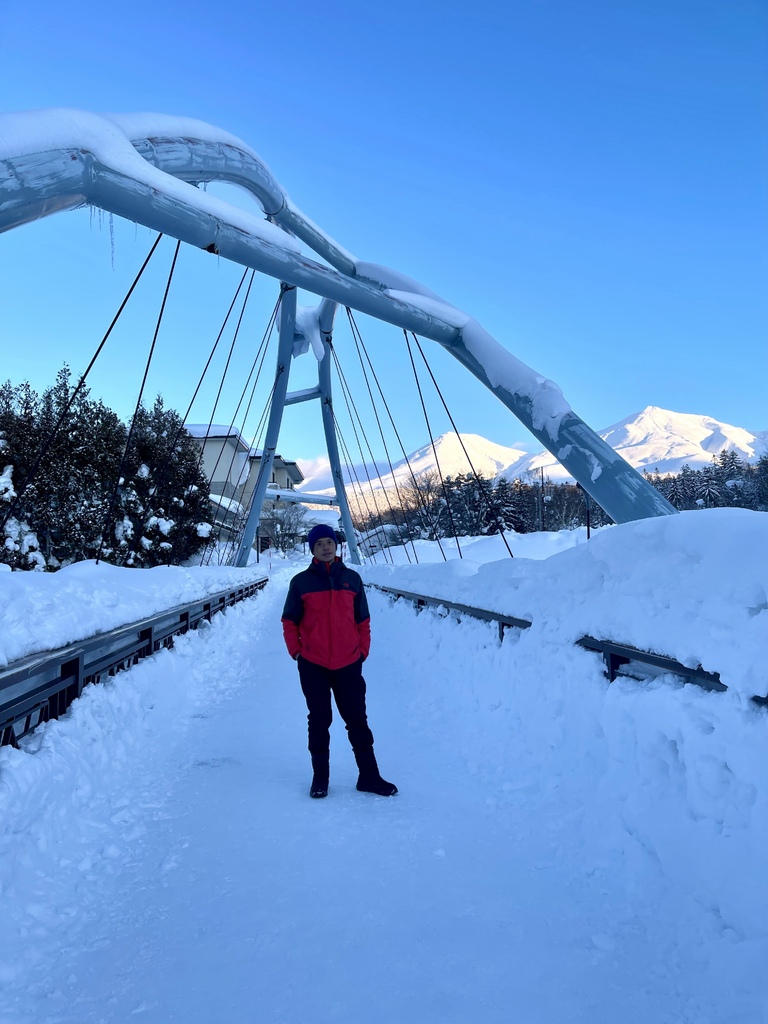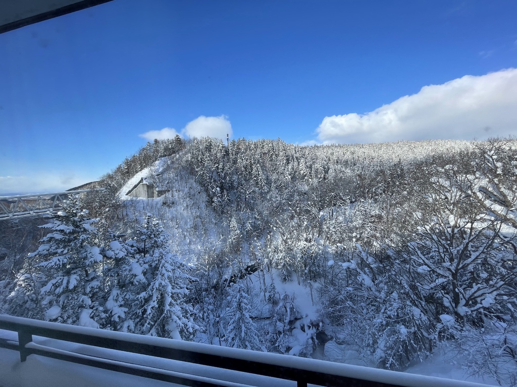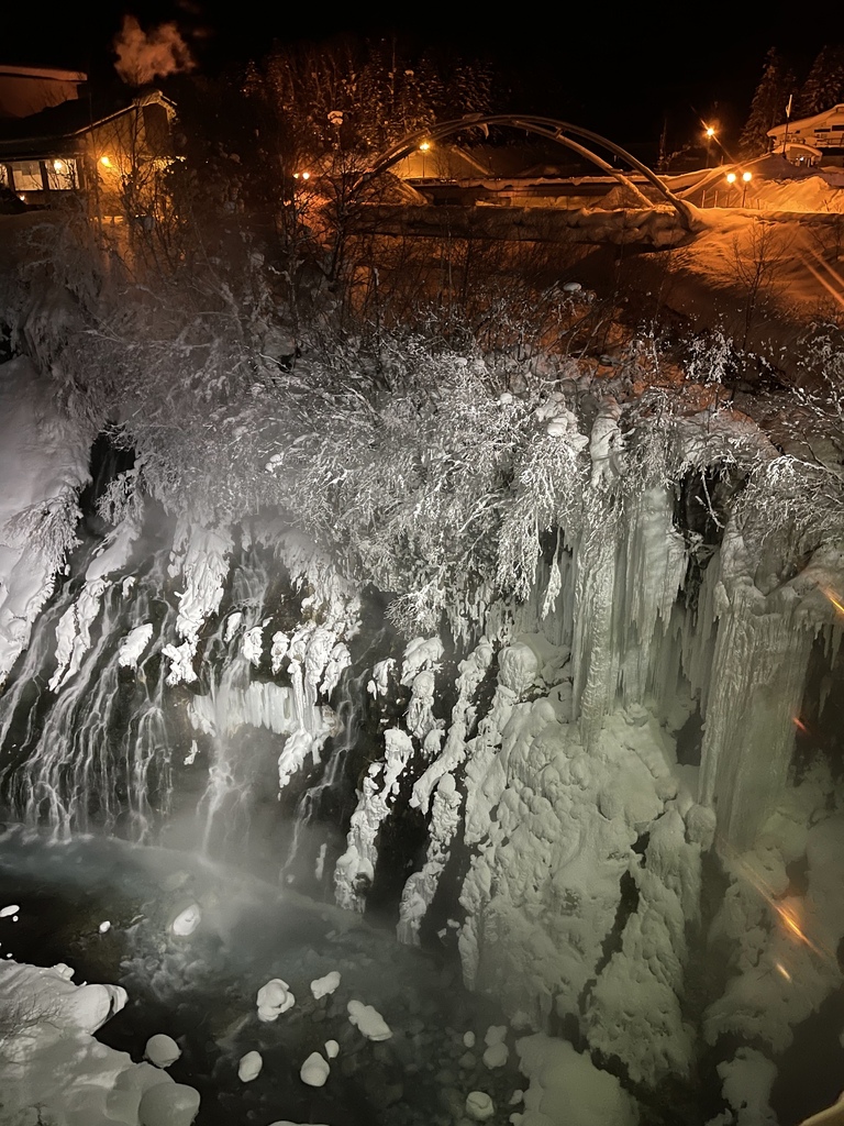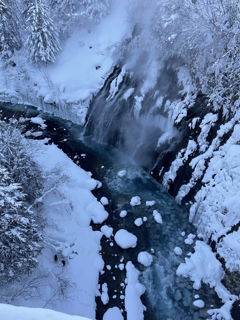 白鬚瀑布應該是有冰柱往下,又被雪覆蓋而很像白鬚吧?後面的十勝岳也很壯觀,而我們住的飯店跟剛剛走過的小鐵橋從這裡也都可以拍到。