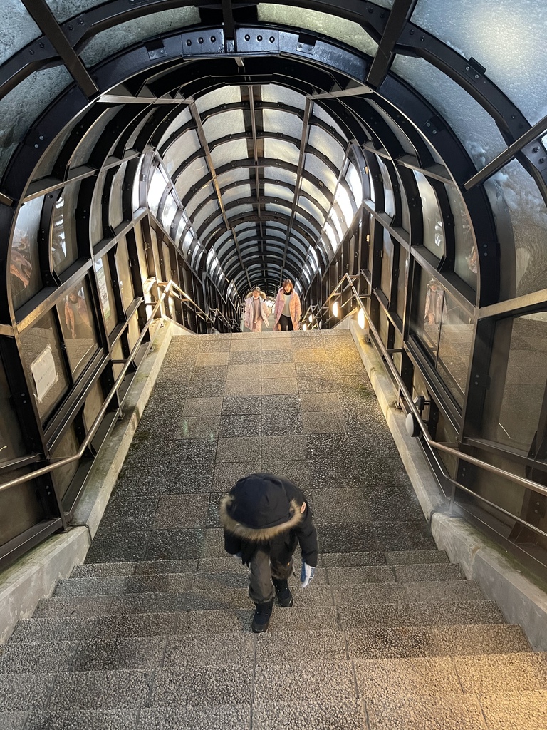 旁邊有座長階梯,剛好工作人員來把「禁止進入」的牌子拿走,我們就順著走,總共快兩百階吧!不過沿路上都有相關的問答,而且第一題的答案在上面第二題的位置,所以就能夠一邊挑戰一邊爬樓梯,像是十勝岳的海拔等問題。