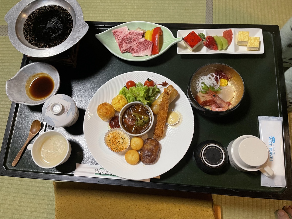 泡完溫泉,就在房間內用餐,這是大人的晚餐組~蓋著的小碗是茶碗蒸,蛋右邊是湯,左上鐵鍋是壽喜燒。走比較精緻的路線,白飯另外盛,我吃起來會飽。