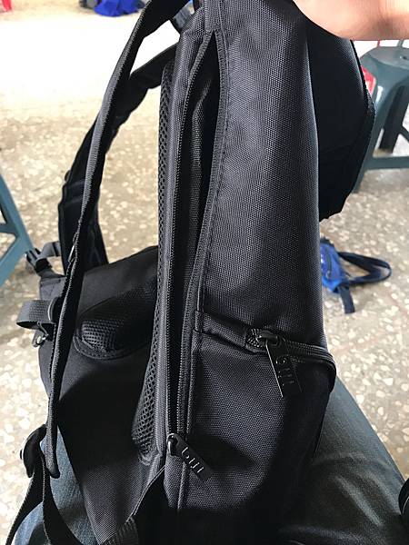 側面一邊是裝水壺網袋,一邊有拉鍊可後放毛巾、衛生紙等小物。